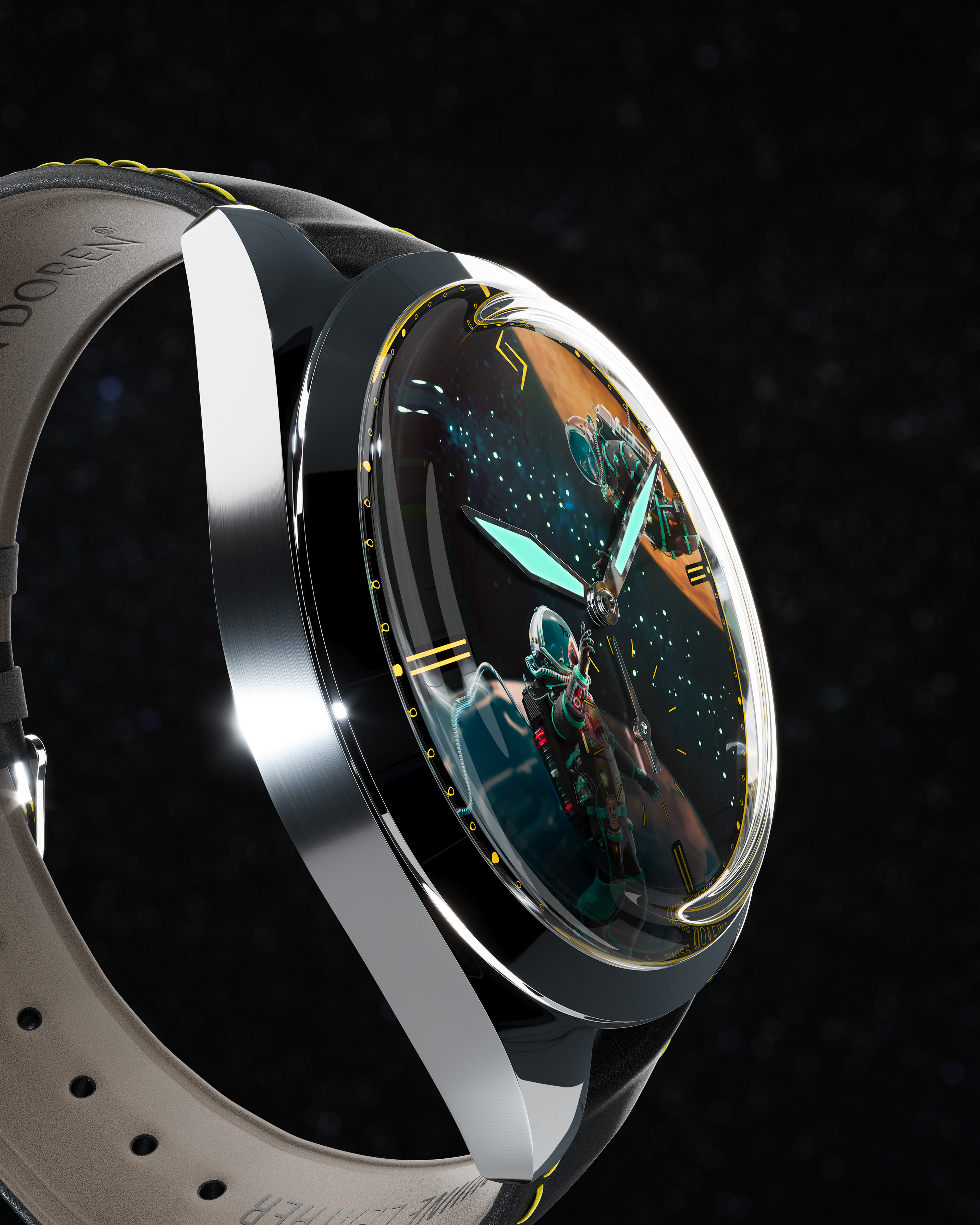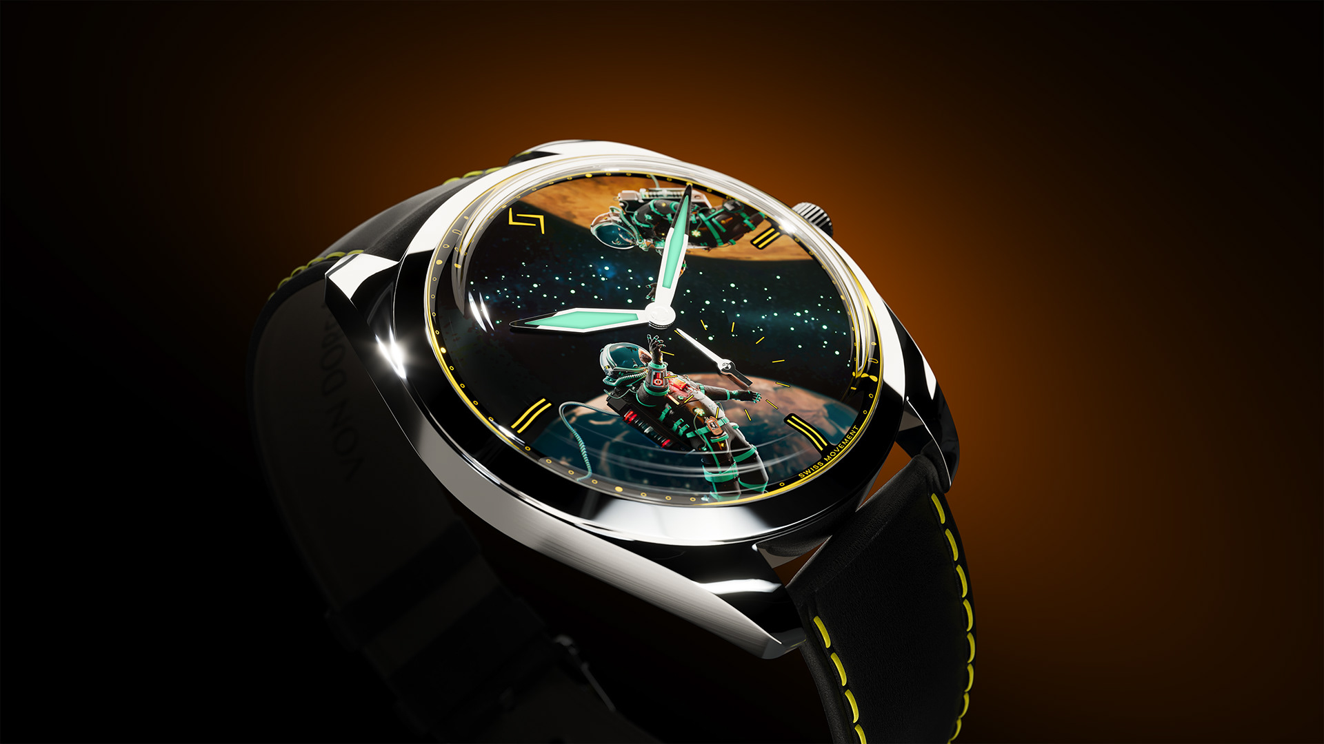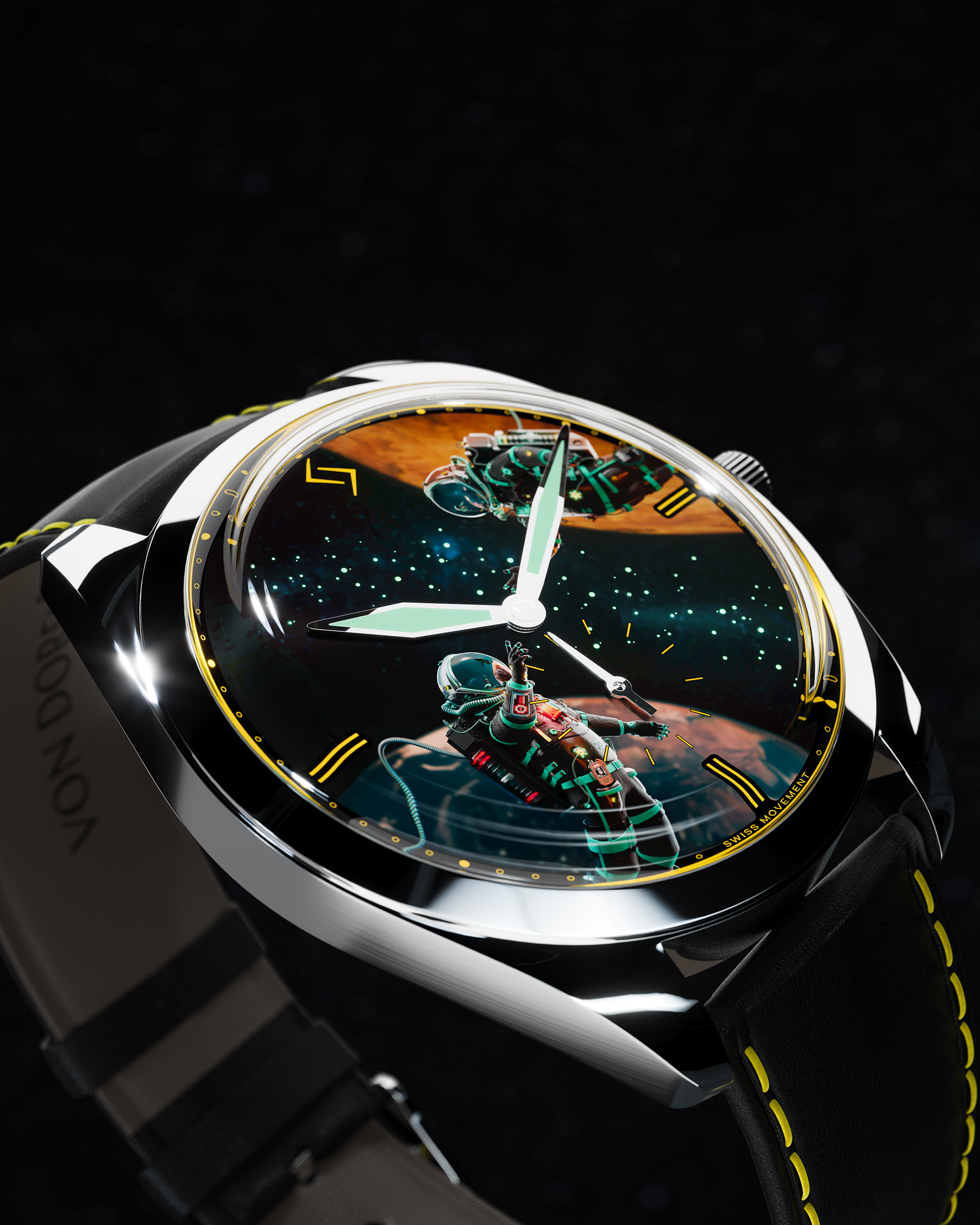 The dial is inspired by space and silence, with a star-filled sky stretching between Earth and Mars.