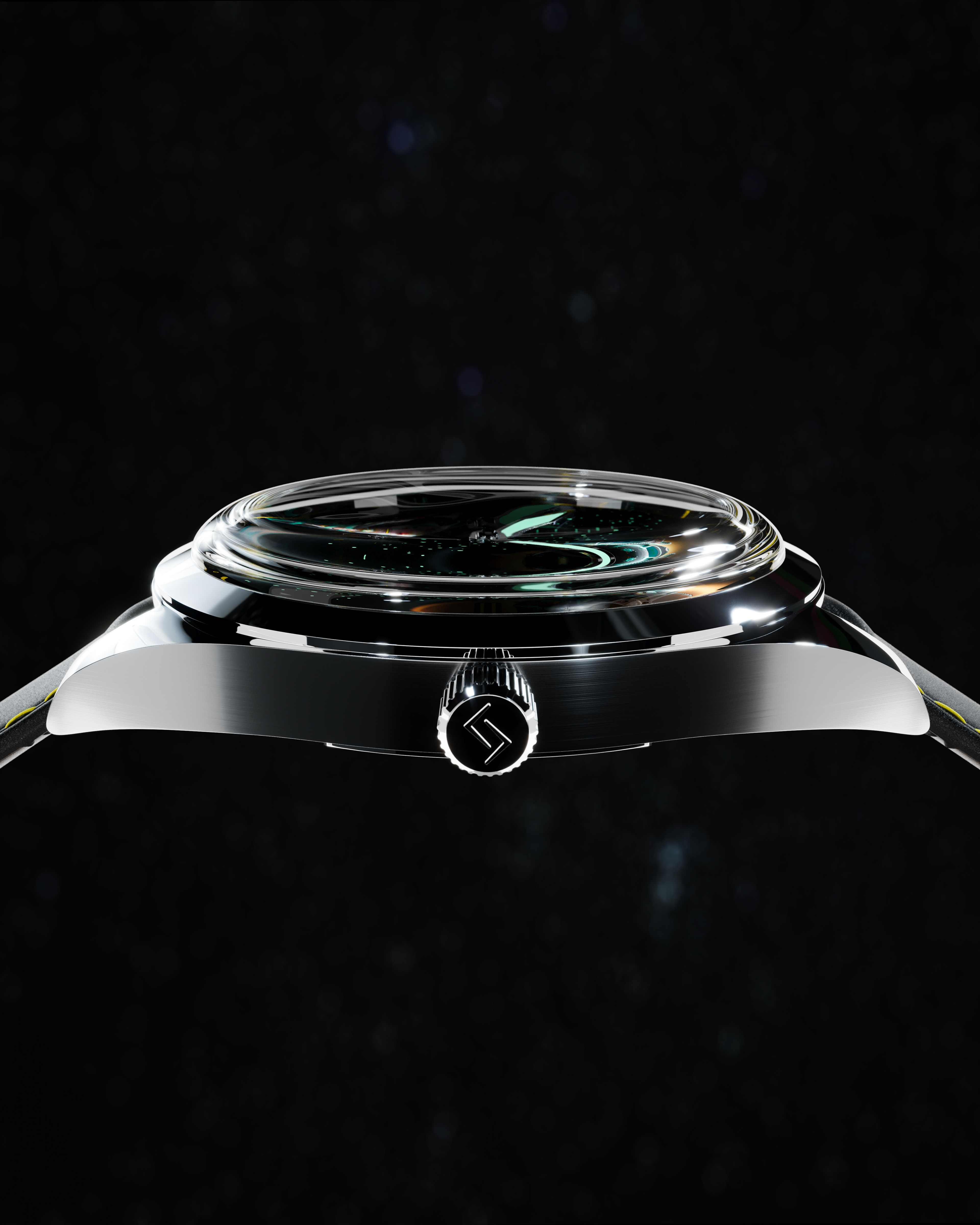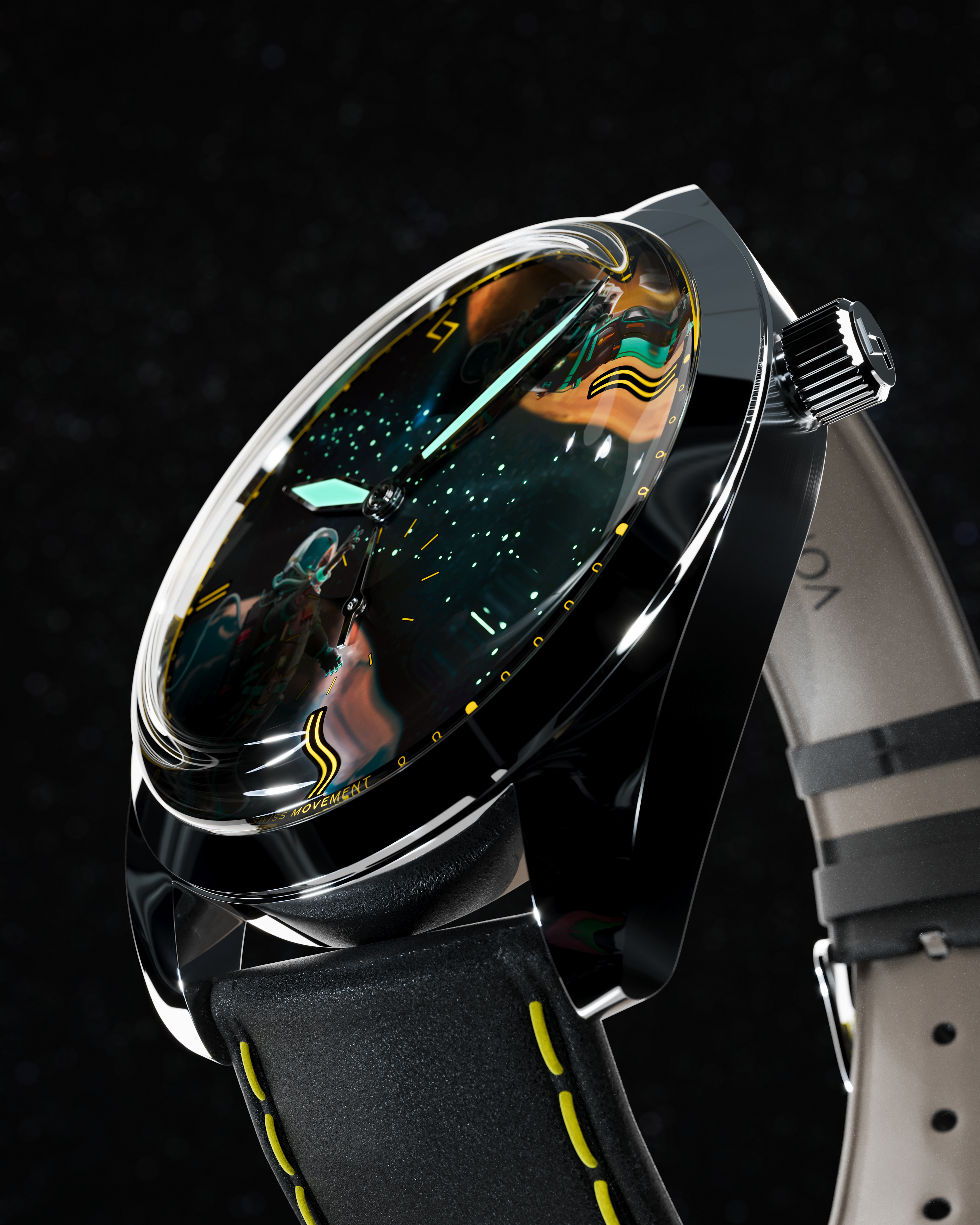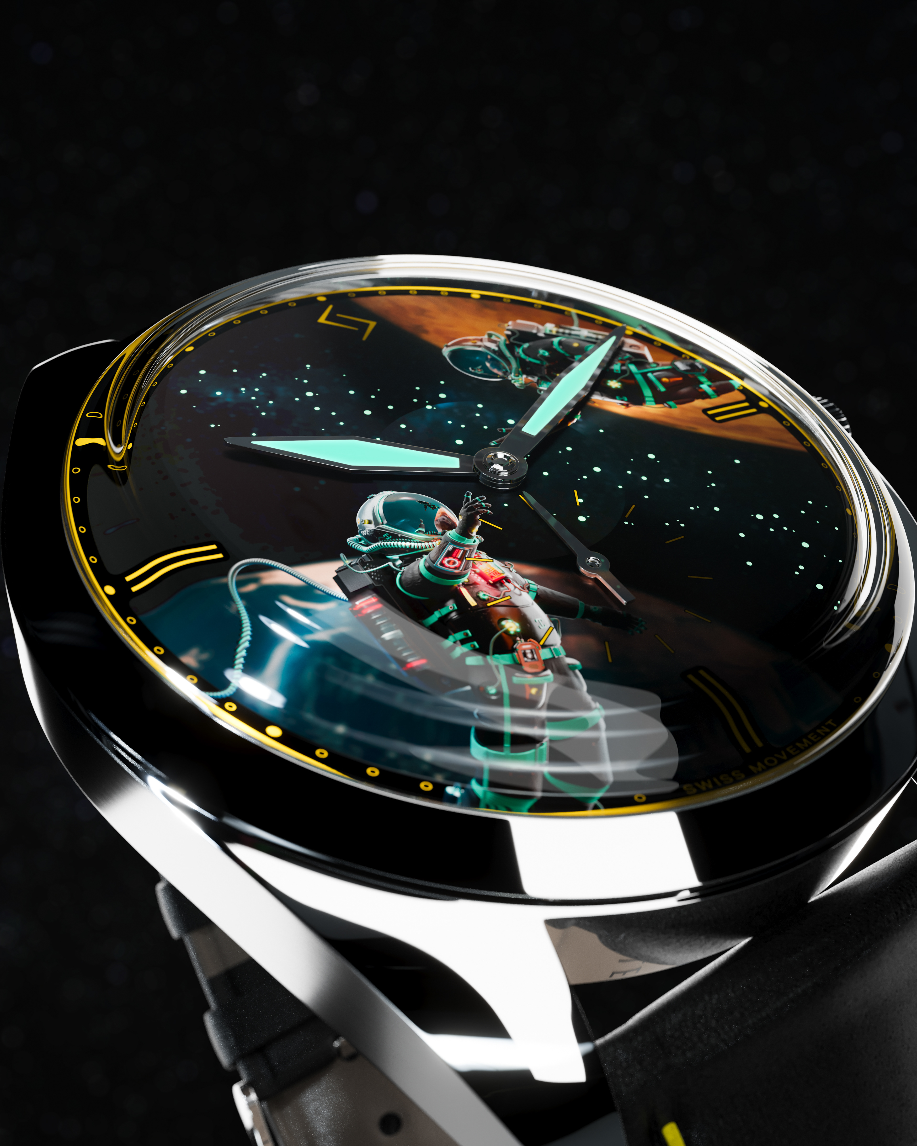 The dial is inspired by space and silence, with a star-filled sky stretching between Earth and Mars.